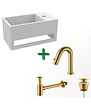 De Fonteinset Mila is gemaakt van Solid Surface, een duurzaam en slijtvast materiaal dat gemakkelijk te reinigen is. De matte witte kleur gecombineerd met het geborsteld goud geeft een luxe uitstraling aan de fonteinset. Het kraangat bevindt zich aan de rechterkant, waardoor het gemakkelijk te gebruiken is. Daarnaast beschikt de fonteinset over een handdoekhouder, wat zorgt voor extra gebruiksgemak.