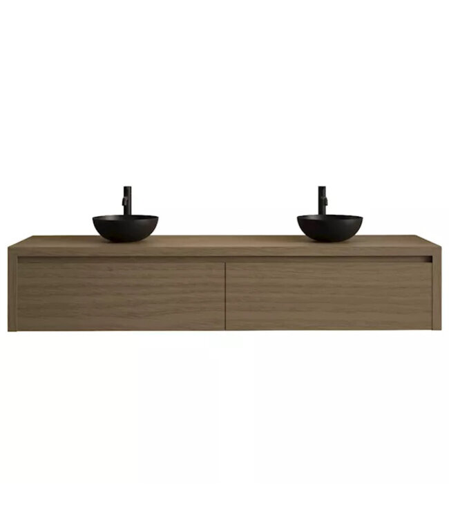 De zwevende wastafelonderkast 180cm Castle Brown met topblad heeft 2 lades, zonder een sifonuitsparing. De lades hebben een solide softclose sluiting dankzij de metalen ladegeleiders van Emuca.