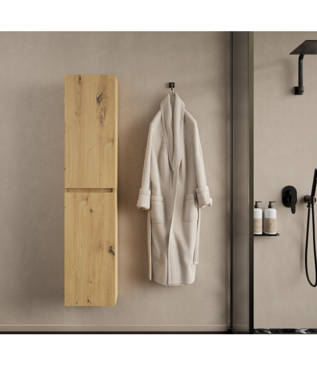 De Milan Artisan Eiken badkamerkast behoort tot onze Milan-serie, ontworpen met aandacht voor detail en vakmanschap. Het gebruik van hoogwaardig melamine materiaal in licht eiken afwerking voegt een vleugje rustieke charme toe aan je badkamer. Met een hoogte van 160 cm, breedte van 40 cm en diepte van 40 cm, is deze handdoeken kast perfect om zelfs in de kleinste badkamers te passen.