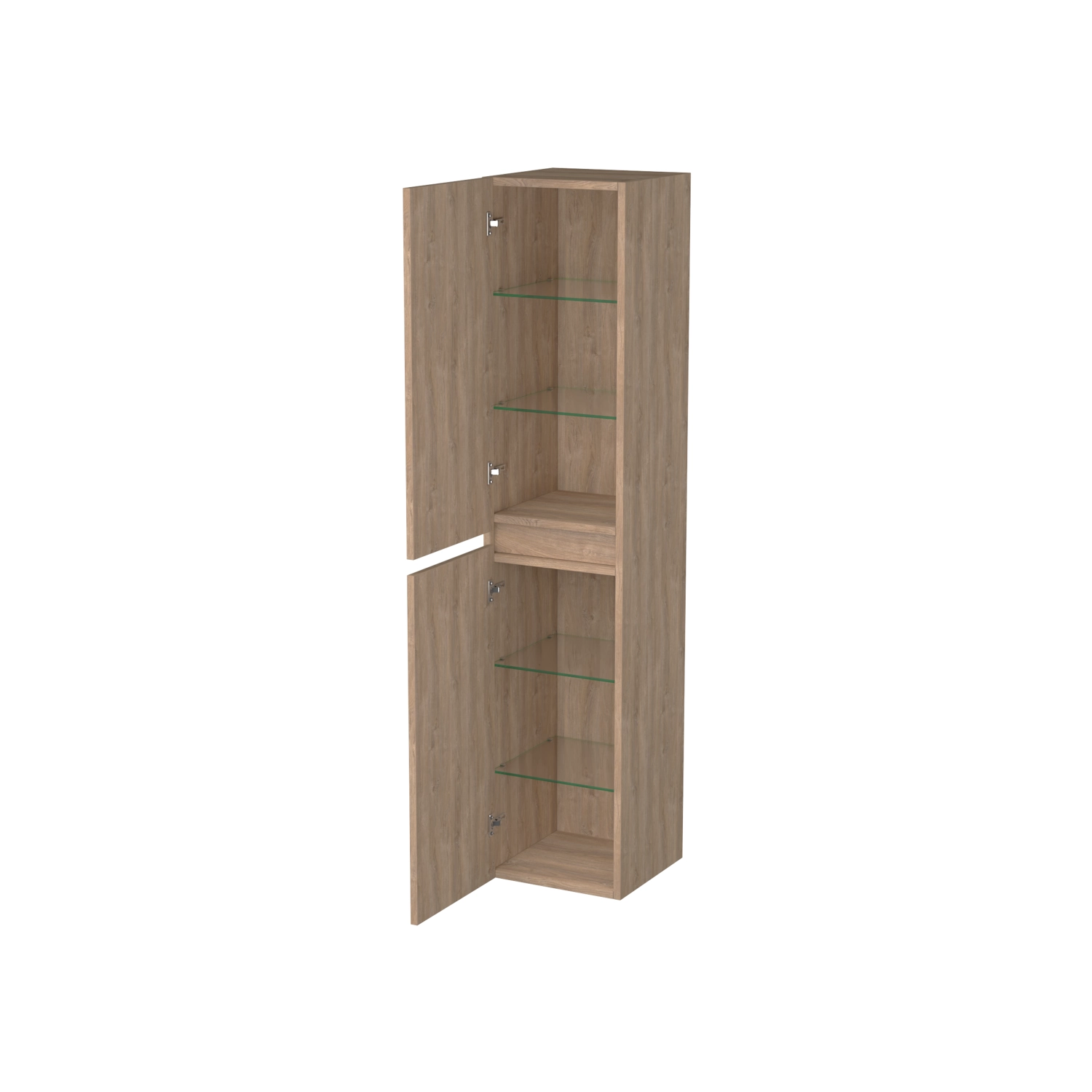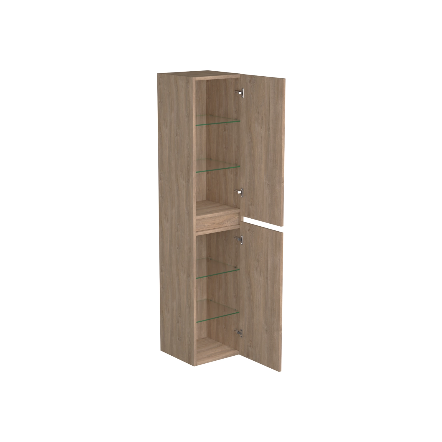 De Badkamerkast Uludag 160×35×35 cm in rustiek eiken combineert natuurlijke schoonheid met slimme opbergruimte. Het warme eikenhout met zichtbare nerf geeft je badkamer een rustieke, karaktervolle uitstraling, terwijl het hoge kolomdesign maximale verticale opslag mogelijk maakt zonder veel vloeroppervlak te benutten. De kast is voorzien van twee deuren die openen naar meerdere glazen legplanken — perfect om handdoeken, toiletartikelen en verzorgingsproducten overzichtelijk en stijlvol op te bergen. Dankzij het duurzame, vochtbestendige materiaal is deze kast uitstekend geschikt voor de vaak vochtige badkameromgeving. De deuren zijn omkeerbaar (links of rechts sluitend) zodat je de kast gemakkelijk aanpast aan jouw indeling. Voor stabiliteit en veiligheid wordt de kast stevig aan de wand gemonteerd.