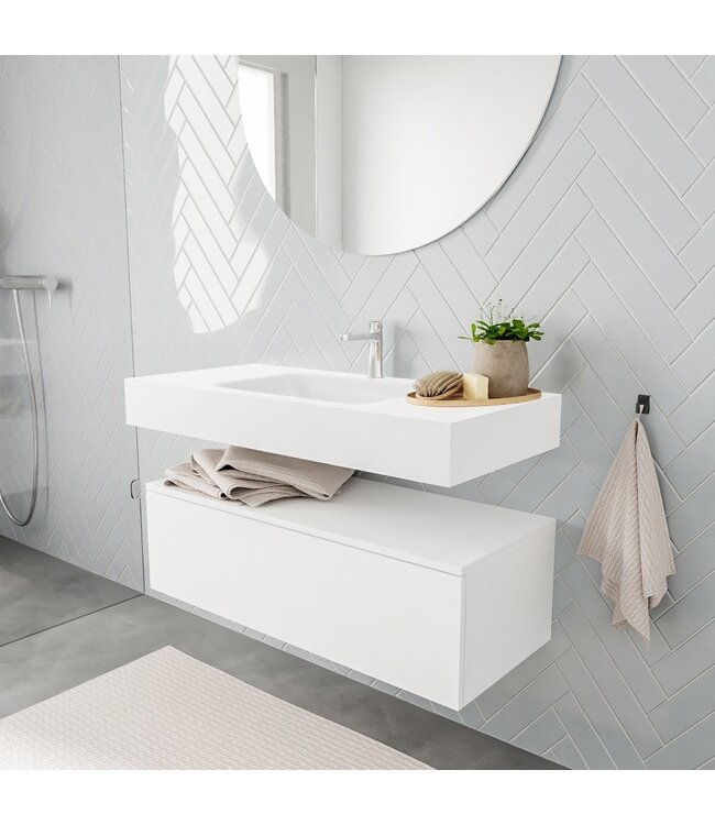 De Alan badkamermeubel set heeft een onderkast van 101 cm breed, 30 cm hoog en 41 cm diep, vervaardigd uit hoogwaardig MDF. De kast beschikt over één ruime lade met push-to-open geleiders, waardoor u eenvoudig toegang heeft tot uw badkamerbenodigdheden zonder zichtbare handgrepen. De wastafel van 100 cm breed, 12 cm hoog en 46 cm diep, gemaakt van Solid Surface, biedt een duurzame en antibacteriële oppervlakte die gemakkelijk schoon te houden is.