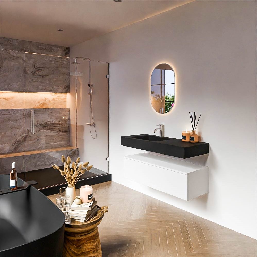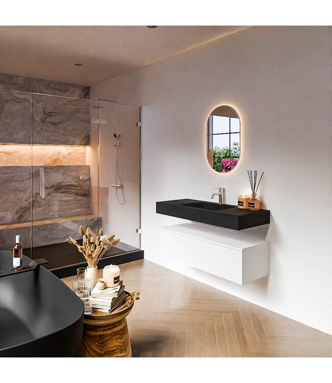 De onderkast is vervaardigd uit duurzaam MDF en heeft een breedte van ca. 111 cm, hoogte van ca. 30 cm en diepte van ca. 41 cm. Het meubel is uitgerust met één ruime lade, voorzien van het handige Push to open-systeem voor een strakke, greeploze look. De vrijhangende wastafel van solid surface in Urban Zwart is 110 cm breed, 12 cm hoog en 46 cm diep, en biedt optioneel links, rechts of midden een praktische spoelbak van 47 cm. De wastafel kan met of zonder kraangat geleverd worden, geheel afgestemd op jouw wensen.