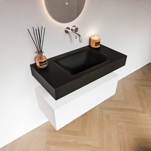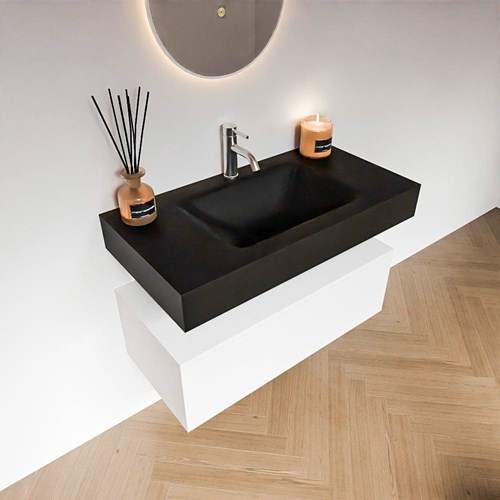De bijpassende vrijhangende wastafel van 90 cm breed en 46 cm diep is gemaakt van antibacterieel solid surface. De wasbak in het midden (47 cm) biedt voldoende ruimte voor dagelijks gebruik, terwijl de strakke lijnen zorgen voor een tijdloos design. Het vrijhangende karakter creëert een ruimtelijk effect en maakt schoonmaken eenvoudiger. De wastafel wordt geleverd zonder kraangat, ideaal voor montage met moderne opbouwkranen.