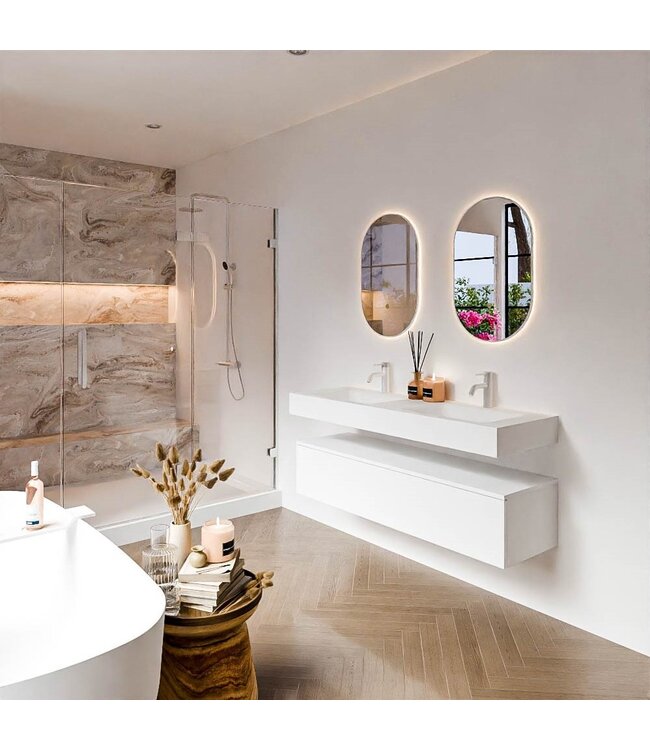De Mondiaz Alan badkamermeubel set combineert luxe, minimalistisch design en gebruiksgemak in één meubel. Dit vrijhangende badkamermeubel is ontworpen volgens de laatste badkamermeubel trends, waardoor het moeiteloos past in zowel moderne als tijdloze badkamers. De combinatie van de strakke lijnen en de zachte Talc-kleur zorgt voor een rustige, verfijnde uitstraling.