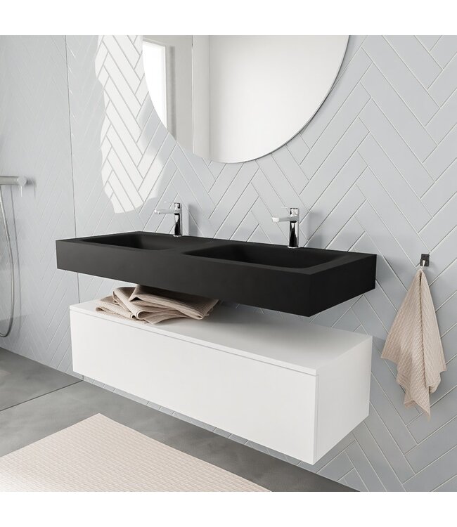De wastafel van 120 cm is vervaardigd uit hoogwaardig solid surface. Dit materiaal is niet alleen hygiënisch en antibacterieel, maar ook onderhoudsvriendelijk. Je kunt kiezen voor een wasbakpositie links, rechts of in het midden. Daarnaast zijn er opties met of zonder kraangat, zodat je het meubel volledig kunt afstemmen op jouw badkamerstijl.