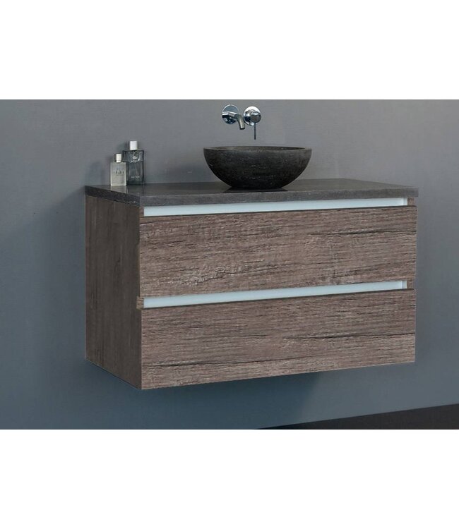 Een prachtig eruitziende Badkamermeubel 80cm met een natuursteen waskom en een onderkast in het kleur OAK gecombineerd met een natuurstenen blad in het kleur mat antraciet. De badkamermeubel heeft twee lades en de beide lades zijn voorzien van een softclo Lees meer.