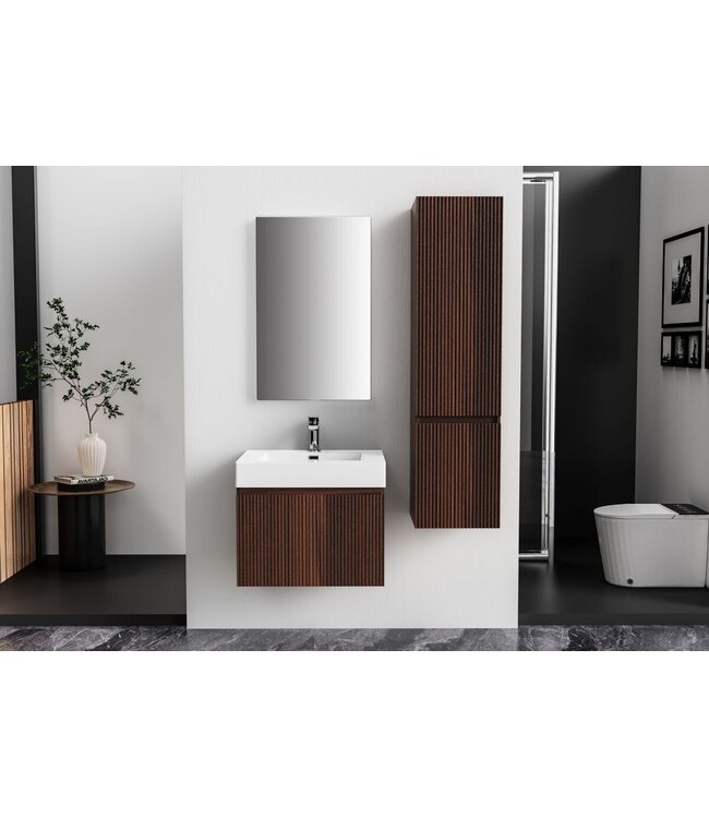 Dit badkamermeubel in walnootkleur straalt warmte en klasse uit dankzij het prachtige ribbelfront en het greeploze design. De natuurlijke houtlook in combinatie met de mat witte wastafel met kraangat zorgt voor een stijlvolle balans tussen modern minimalisme en tijdloze elegantie.