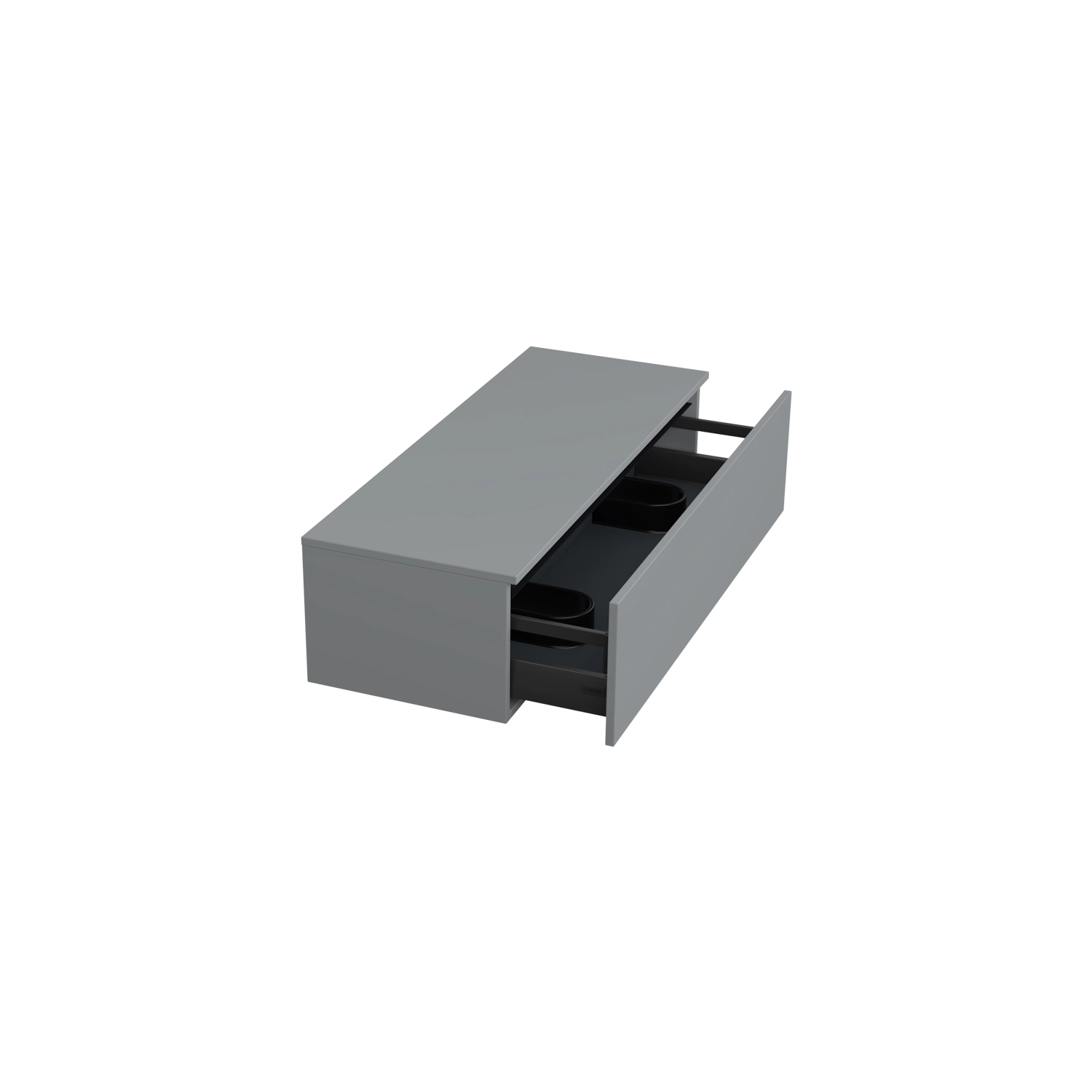 Deze onderkast met topplaat is vervaardigd van FSC-gecertificeerd MDF, wat duurzaamheid en kwaliteit garandeert. De mat grijze afwerking geeft uw badkamer een moderne en rustige uitstraling. Met één ruime lade, voorzien van een softclose-systeem, opent en sluit de lade geruisloos en veilig.