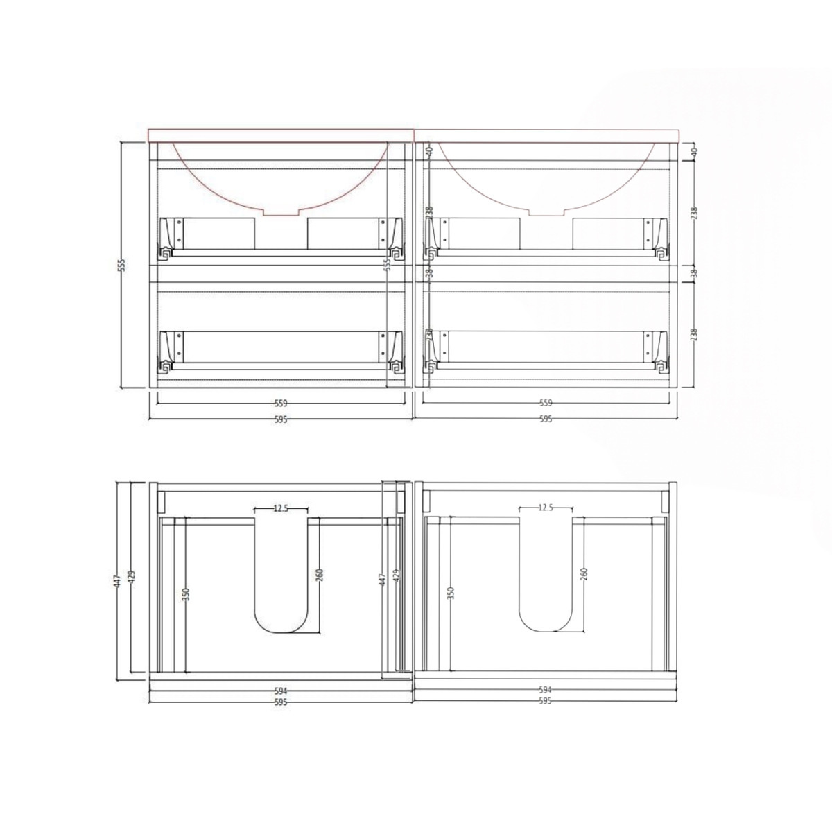 Afmetingen badkamermeubel bxdxh | 1200x447x575mm (2x60cm onderkasten) |