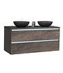 Dit badkamermeubel set van Trend Dynasty serie bestaat uit een wastafelonderkast 120cm, een natuurstenen topblad 120cm met twee uitsparing voor het sifon en twee natuurstenen waskommen van 38x13 cm. Het natuurstenen topblad heeft geen kraangat. Deze kan desgewenst voor u voorgeboord worden. Informeert u naar de mogelijkheden.