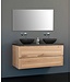 De badkamermeubel onderkast is gemaakt van Wood Eiken / Multiplex gefineerd waterdicht materiaal. Het blad en de waskommen zijn van natuursteen. De meubel heeft 2 greeploze lades met soft close functie. De afmetingen zijn 120 cm breed, 47 cm diep en 50 cm hoog.