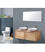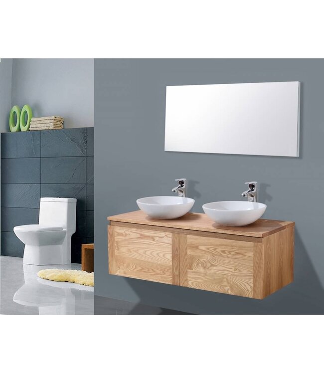 De onderkast is gemaakt van massief eikenhout en beschikt over één soft-closelade. Dit badkamermeubel is leverbaar in 4 verschillende afmetingen. 80cm, 100cm 120cm en 160. (160 cm = 80+80 met een topblad 160cm) waarin u verschillende badkamerproducten kwijt kunt. Bovenop de kast wordt een topblad bevestigd dat een hoogte van 3 cm heeft. Dit wastafelblad heeft een houtkleur en is gemaakt van massief hout.