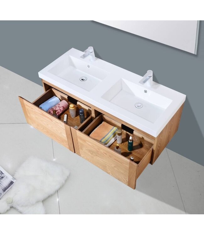 Deze bijzondere Masief eiken badkamermeubelset bestaat uit een onderkast en een kunstmarmer wasbak, en een badkamerspiegel. De onderkast is gemaakt van massief eikenhout en beschikt over één soft-close lade. Deze badkamermeubel is leverbaar in drie verschillende afmetingen. 80cm, 100cm 120cm. (twee lades naastelkaar bij de 120 cm-variant) waarin u verschillende badkamerproducten kwijt kunt. Bovenop de kast wordt een waskom bevestigd die een hoogte van 5 cm heeft. Dit wasbak is wit van kleur en is gemaakt van Kunstmarmer.Kunstmarmer is een materiaal dat geen poriën bevat en waar zich dus geen vuil aan kan vasthechten. Bovendien verkleurt het niet en is het waterdicht. Het onderhoud dient voorzichtiger te gebeuren. Er kunnen bijvoorbeeld wat vlugger krasjes op komen. Als er een klein deeltje stukbreekt, is dat makkelijker te vervangen dan bij porselein.