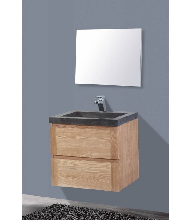 Een prachtig eruitziende Wood Eiken - Multiplex gefineerd waterdicht onderkast gecombineerd met een Natuurstenen wastafelblad in net kleur antraciet mat. Het Badkamermeubelset Wood Stone 60x47x50cm is van het merk SaniPro Lees meer.