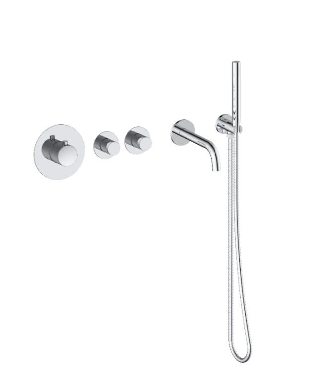 Deze badkraan wordt geleverd met een handige draaiknop voor het omstellen tussen de verschillende functies. Met maar liefst drie uitgaande aansluitingen kun je moeiteloos schakelen tussen de kraan, de handdouche en andere accessoires. De bijgevoegde handdouche set met staaf handdouche en een doucheslang van 1500 mm bieden extra gemak en flexibiliteit tijdens het douchen of schoonmaken van het bad.