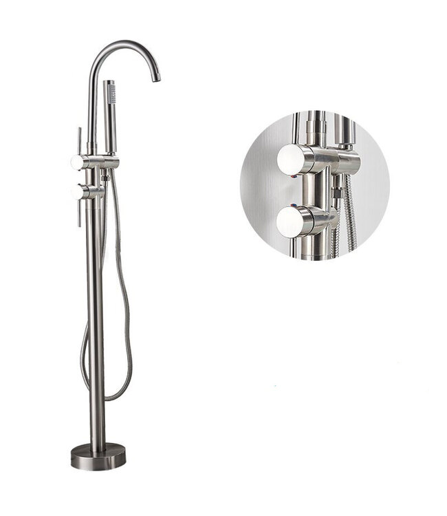 U bent ze vast en zeker tegengekomen in een van de borchure's of een van de inspiratiebladen voor een droombadkamer. Een Vrijstaand bad en een badkraan vrijstaand ernaast die schittert van stijl. Een vrijstaand badkraan RVS Gebrosteldvan het merk SaniPromet een handdoucheis de modernste en meest trendy product voor nu.