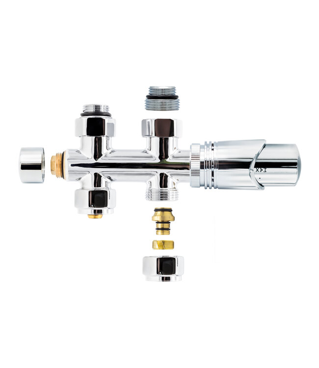 De radiatorknoppen zijn los leverbaar . deze kraan kan in alle ruimtes toegepast worden waar de thermostaat geen invloed heeft . door montage van deze kraan kan de temperatuur afzonderlijk per vertrek geregeld worden . de klemring met drukmoer om de leiding aan de kraan te monteren is bijgeleverd.