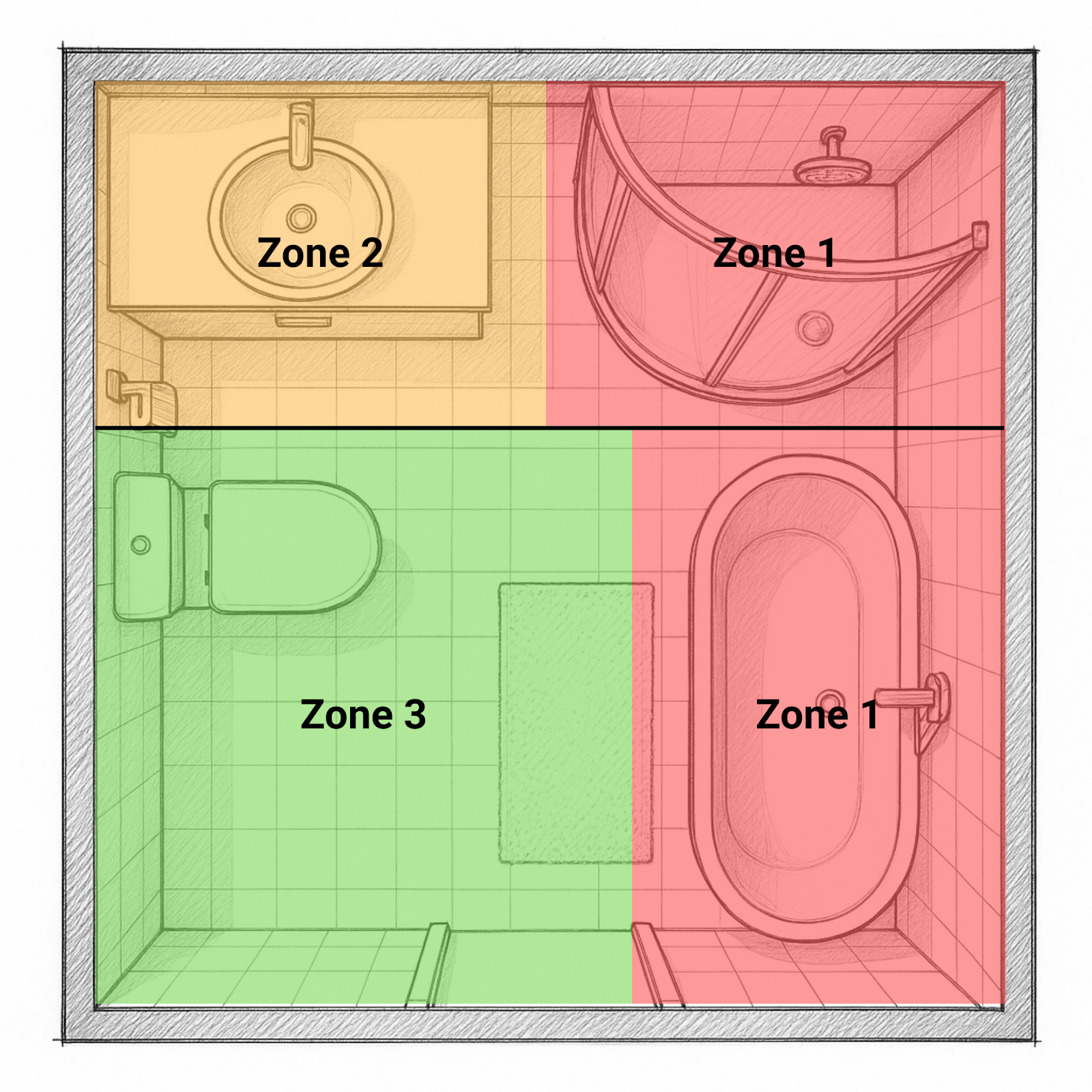 Op de onderstaande afbeelding werken we de zones in een gemiddelde badkamer uit. Zo heeft u een algemeen beeld van hoe de ruimte is opgedeeld en waar specifieke IP-waarden voor verlichting noodzakelijk zijn: