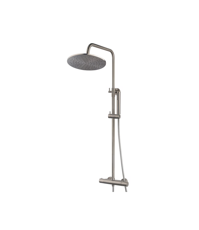 De doucheset is vervaardigd uit hoogwaardig messing met een PVD-coating in een elegante geborsteld stalen afwerking, waardoor het niet alleen stijlvol oogt maar ook duurzaam en bestand is tegen corrosie. De tweegreeps thermostaatkraan zorgt voor een precieze controle over de watertemperatuur, terwijl het keramische cartouche-afsluitmechanisme garant staat voor een lange levensduur.