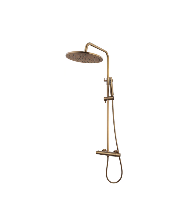 Maak kennis met de Wiesbaden Caral Opbouw Doucheset met Thermostaatkraan Geborsteld Koper Brons met ronde regendouchekop van 25cm breed. Deze complete regendoucheset wordt geleverd met een thermostatische douchemengkraan, staaf handdouche met een 150cm lange doucheslang wat betekent dat je altijd kunt genieten van een constante watertemperatuur en stevig straal ongeacht welke kant je dan gebruikt. De temperatuurblokkering op 38°C zorgt voor extra gemoedsrust.