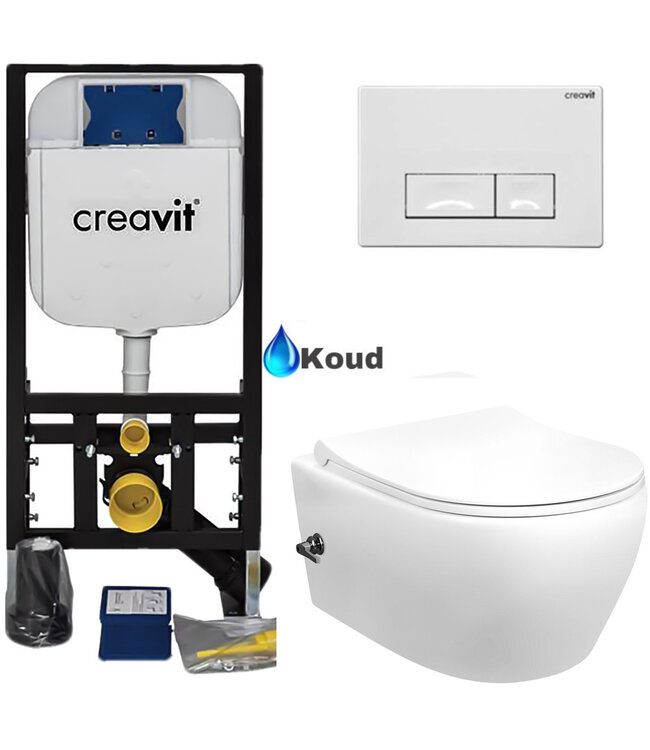 Ben je op zoek naar een hoogwaardige toiletset die comfort, stijl en hygiëne combineert? De Creavit Toiletsets met bidetfuntie en met name geintegreerde bidetkraan bieden de perfecte oplossing. Wij bieden u nu voor de aller scherpste prijs deze glans witte hangtoilet set met de geïntegreerde bidetkraan koud. Voeg nu vleugje comfort en extra hygiene toe aan je badkamer.