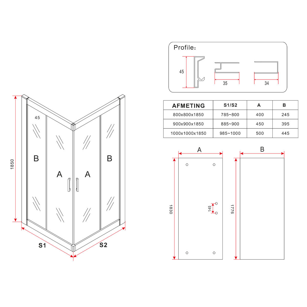 De Douchecabine 100x100 cm Liz Schuifdeurheeft een 6 mm veiligheidsglas en is zowel links als rechts in de hoek te monteren. Maximale flexibiliteit en een duidelijke installatiehandleiding, zodat u daar gewoon zelf mee aan de slag kunt.