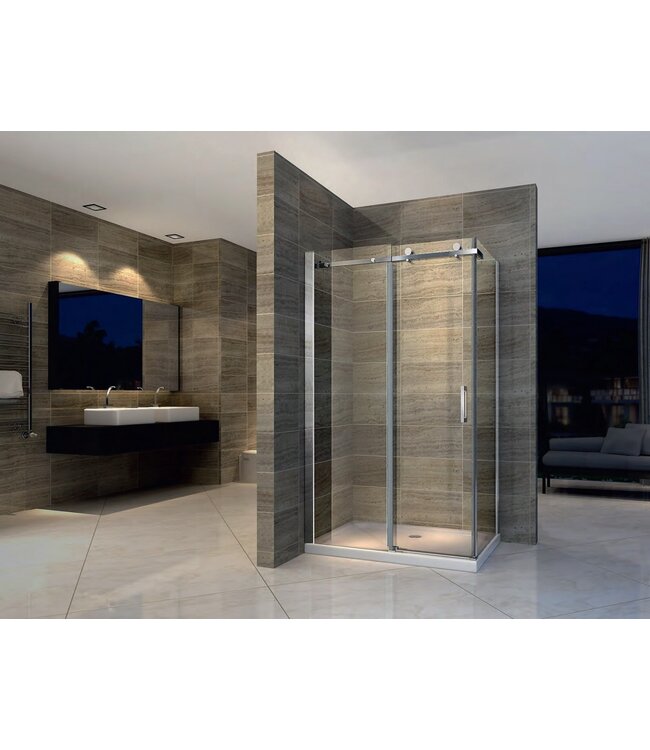 De douchecabine betredt u doormiddel van een schuifdeur.. Boven is in de deur bevinden zich twee rollen op de stabilisatierail. Deze rollen glijden over de rails en zorgen ervoor dat de deur makkelijk geopend en gesloten kan worden. Onderaan de deur bevind er een deur geleider, zodat de schuifdeur stabiel blijft.