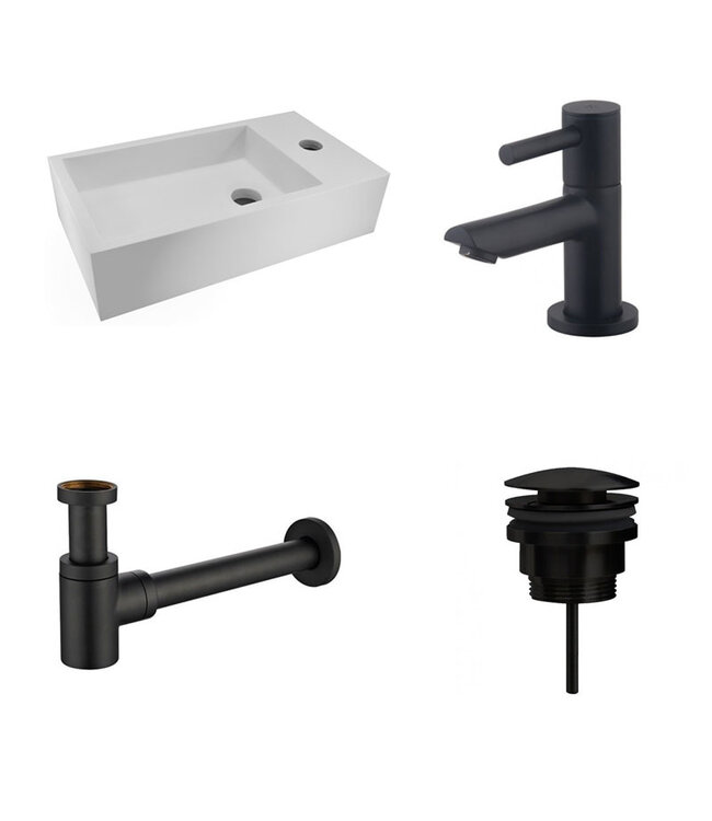 De Fonteinset Nila Mat Zwart Solid Surface Rechts is een complete fonteinset uit de Diamond Line collectie. De fonteinset bestaat uit een wastafel een toiletkraan met hendel bediening een clickwaste en een sifon. De fonteinset heeft een rechthoekige vorm en is 40 cm breed 10 cm hoog en 22 cm diep.