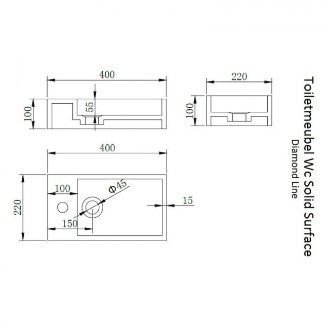 Fonteinset Nila Solid Surface RVS Links 40x22x10cm Toiletkraan clickwaste Sifon RVS
