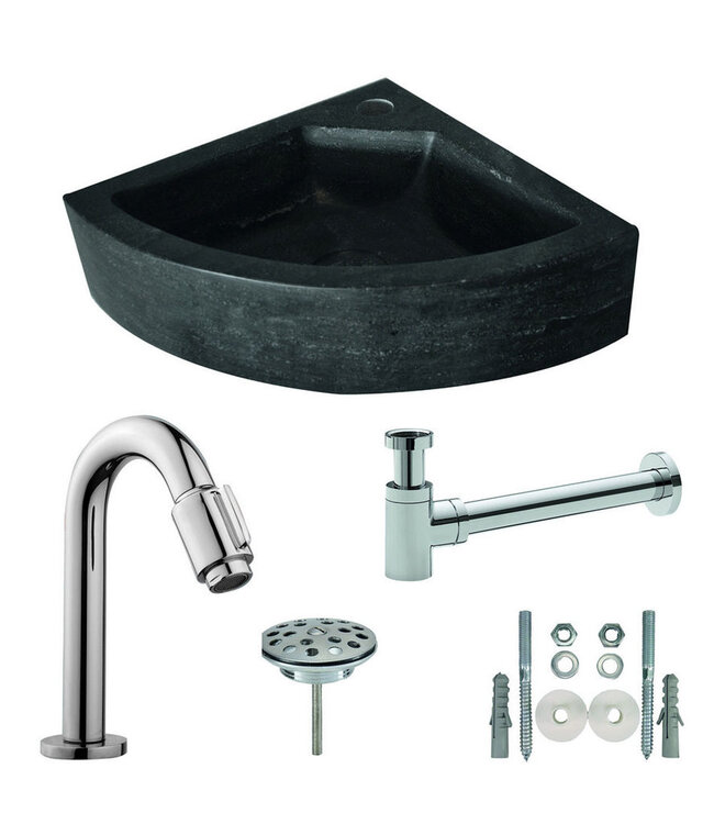 Deze hoekfontein is niet alleen compact van formaat, maar ook duurzaam dankzij het gebruik van hoogwaardig hardsteen. Het antraciet/zwarte kleurenschema voegt een eigentijds tintje toe aan elke badkamerinrichting. Compleet geleverd met alle benodigde accessoires, inclusief een toiletkraan, sifon, vaste waste in chroomkleur en plugboutenset, is dit de ideale keuze voor wie op zoek is naar een complete fonteinoplossing.