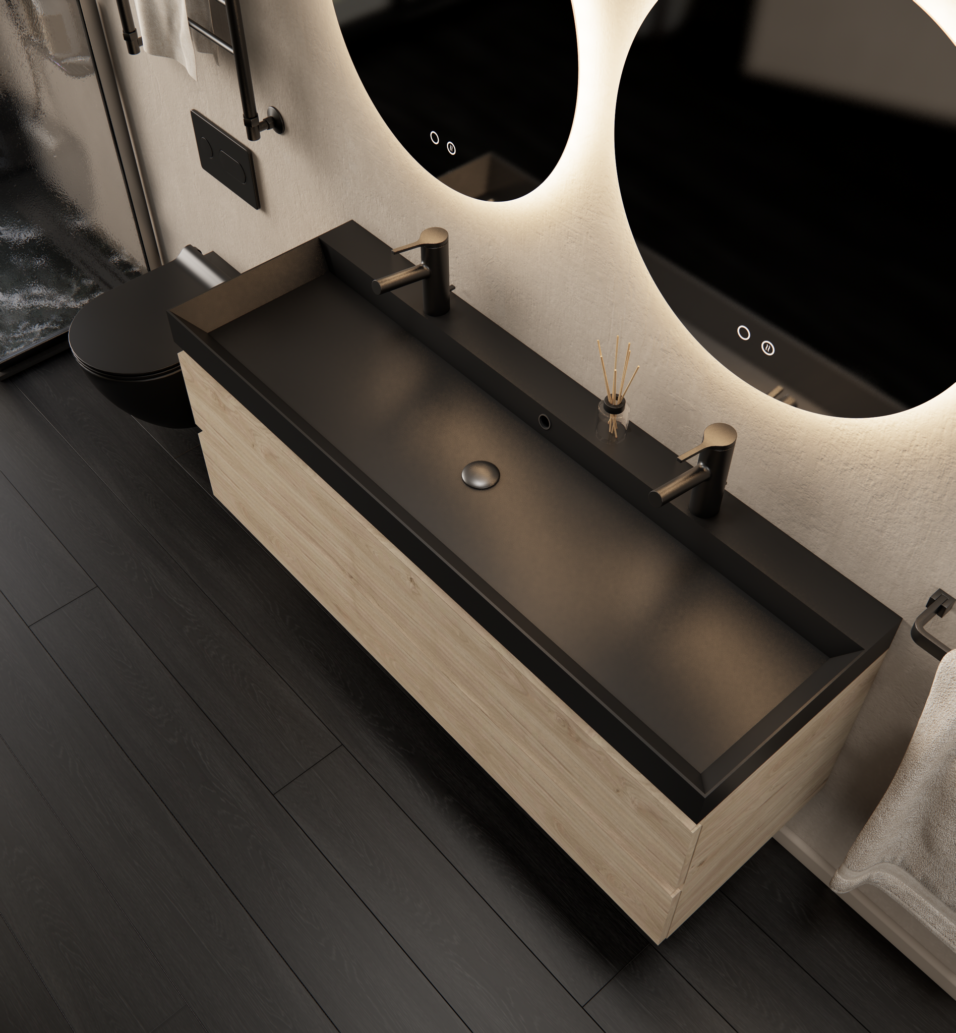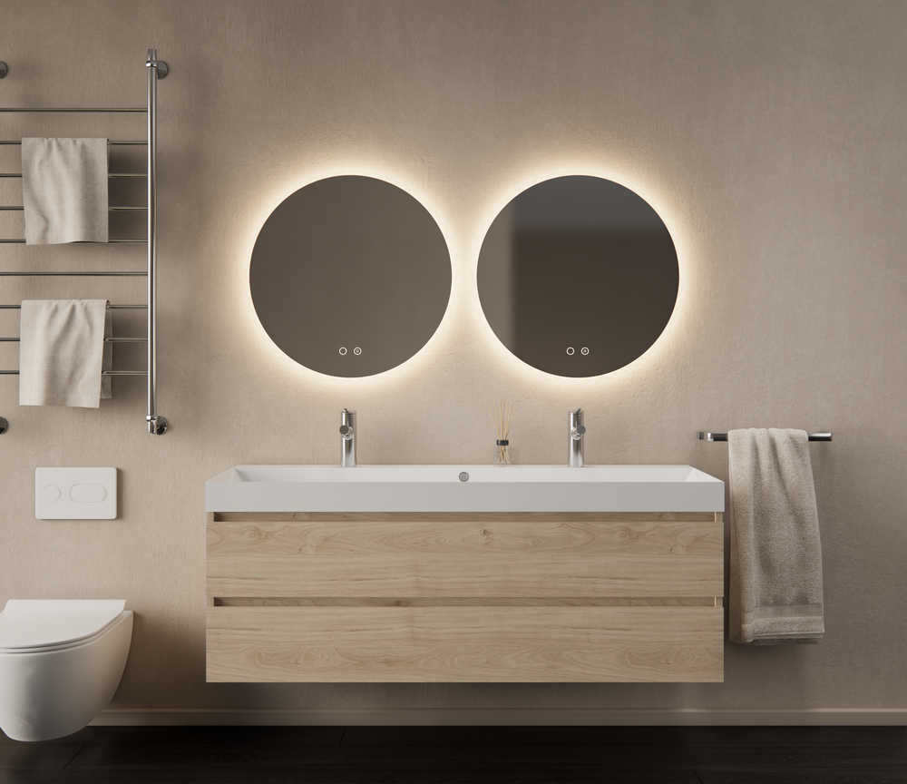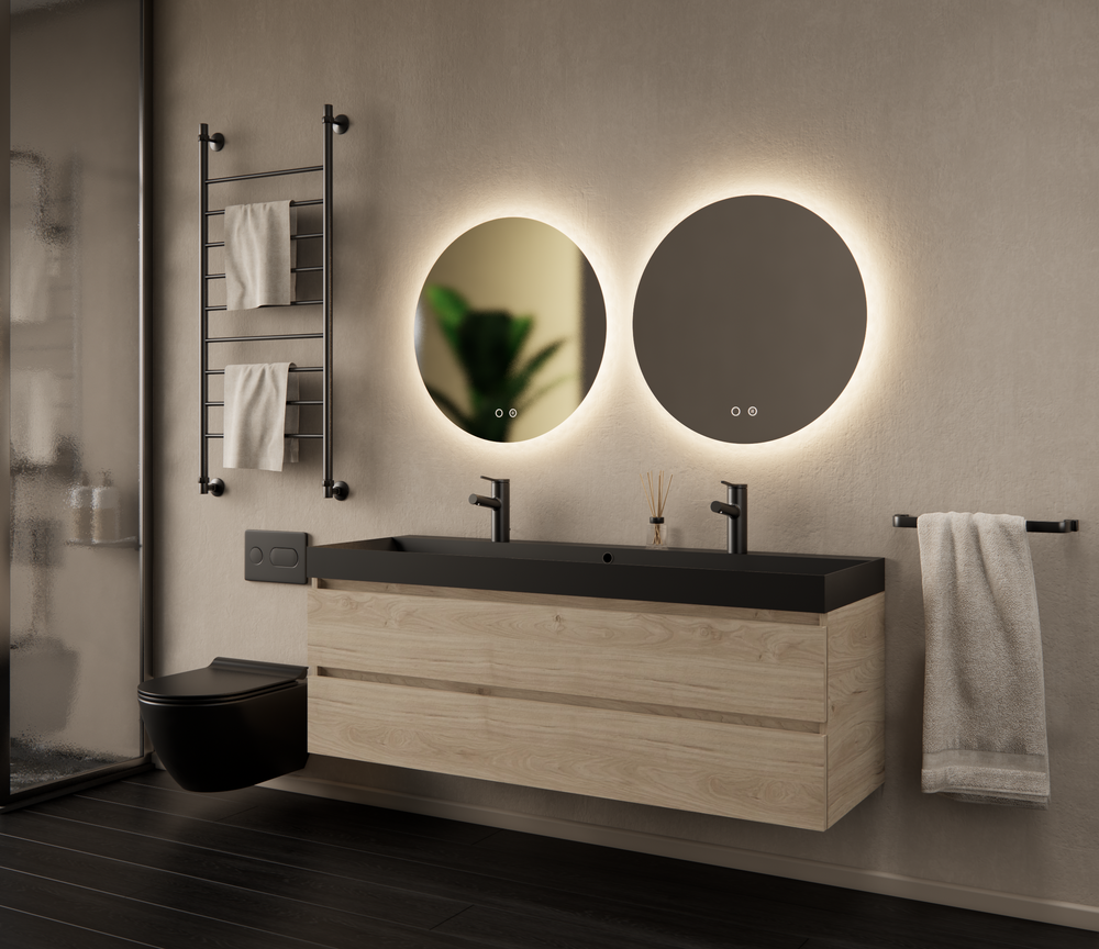Dit badkamermeubel is voorzien van twee greeploze lades, elk met DTC softclose ladegeleiders. Open en sluit de lades moeiteloos en geruisloos. De kast is uitgevoerd in duurzaam melamine op een MDF-basis, met het FSC-keurmerk voor verantwoord bosbeheer. Deze combinatie maakt het meubel bestendig tegen vocht en eenvoudig te onderhouden.