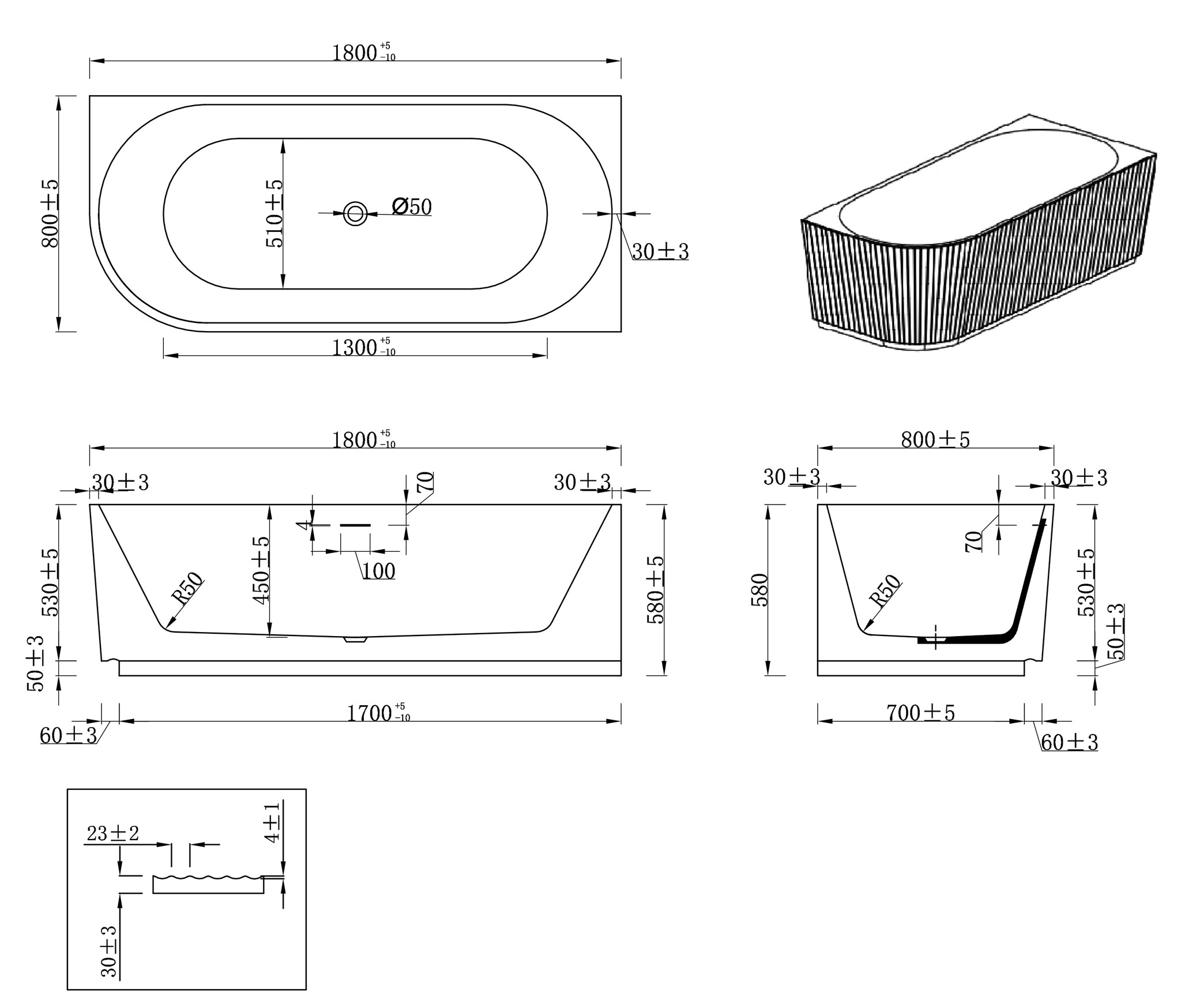 Halfvrijstaand Hoekbad Rechts met ribbels – Rivi Glans Wit 180x80cm - 21.3686