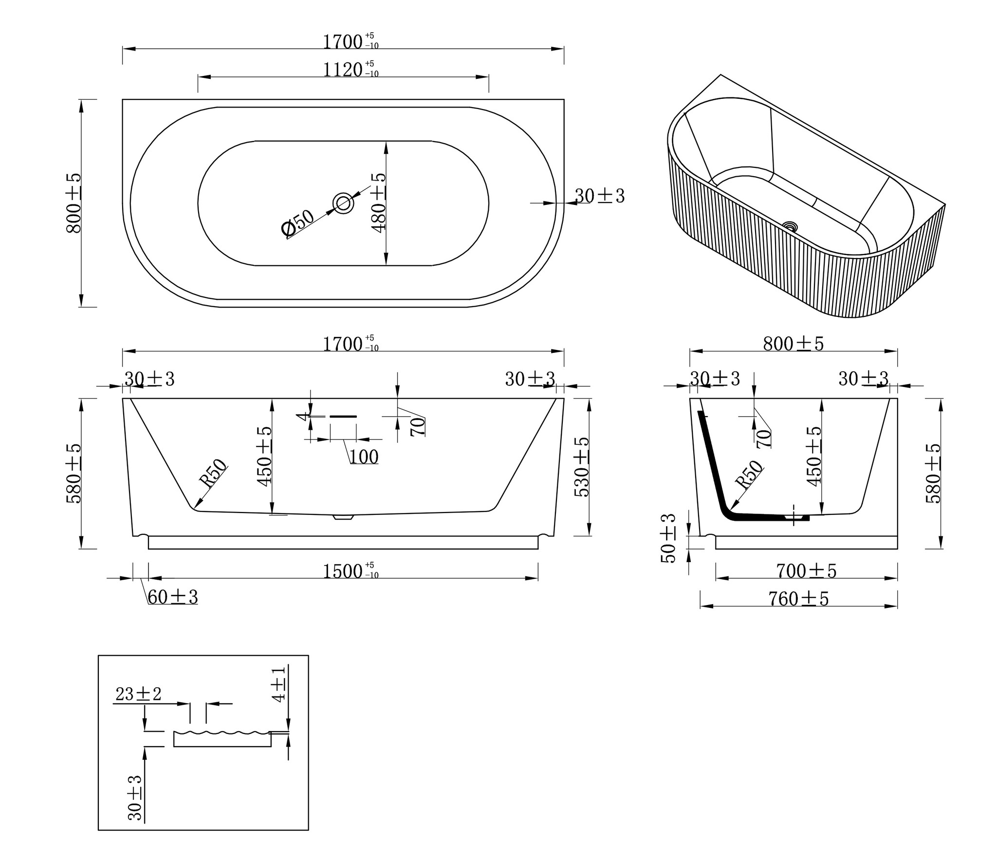 Halfvrijstaand ligbad met ribbels – Rivi Glans Wit 170x80cm