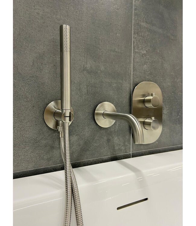 De inbouw badkraan heeft een thermostaatfunctie met een temperatuur begrenzer. De inbouwkraan wordt compleet geleverd inclusief inbouwdeel, afdekplaat, een handdouche met houder en een bijpassende doucheslang van 150cm.