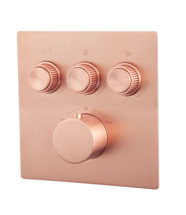 Bij het verfijnen van je doucheruimte draait alles om controle, gemak en veiligheid. Met de Caral Klik Pro afbouwdeel 3-wegs inbouwthermostaat, geborsteld koper, ben je verzekerd van een naadloze doucheregeling die voldoet aan al je behoeften.