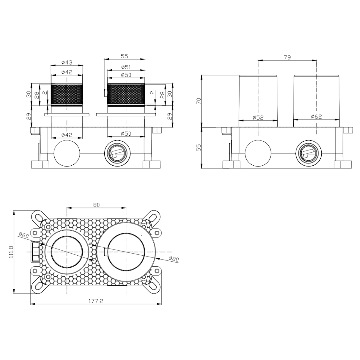 Achter het strakke, matzwarte design schuilt slimme engineering. De extreem ondiepe inbouwmaat van 55 mm is niet alleen een esthetisch, maar ook een praktisch installatievoordeel. Het afbouwdeel van deze thermostaatkraan is vervaardigd uit hoogwaardige materialen die een lange levensduur garanderen. De robuuste draaiknoppen met het speciale reliëf motief zorgen niet alleen voor die perfecte grip, maar geven de kraan ook een unieke, tactiele luxe uitstraling. Deze 2-weg functie, met de handige aparte stopkraan, maakt het een functioneel en minimalistisch meesterwerk.