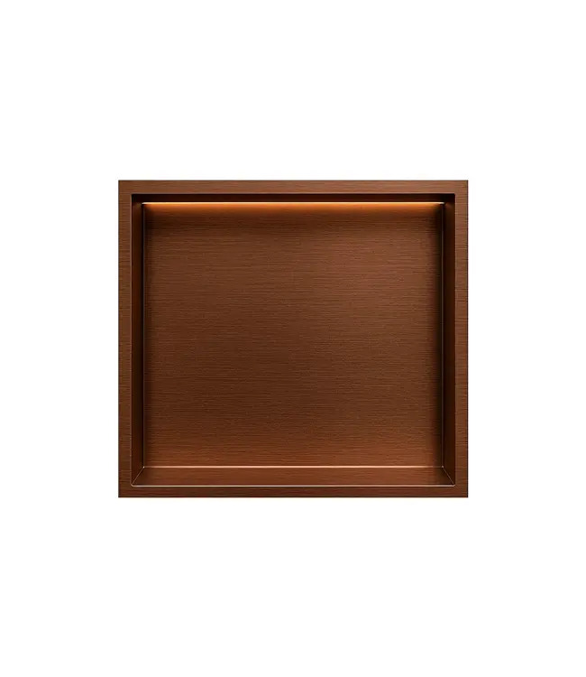 Deze luxe Inbouwnis badkamer met LED-licht 30x30x7cm Geborsteld Brons Koper uit de DutchLine collectie vormt de perfecte combinatie tussen design en functionaliteit. Deze badkamer nis creëert extra opbergruimte voor shampoo, douchegel, scrubs of accessoires en is een eyecatcher in iedere moderne of klassieke badkamer.