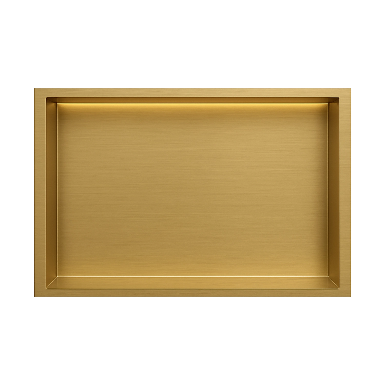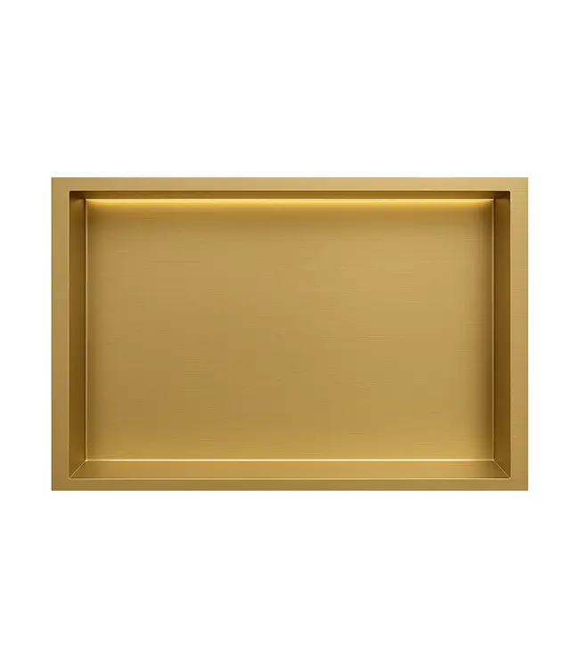 Transformeer uw badkamer met de luxe uitstraling van de DutchLine Inbouwnis badkamer met LED-licht 60x30x7cmin geborsteld messing goud. Deze hoogwaardige inbouw badkamer nis biedt niet alleen praktische opbergruimte voor shampoo, douchegel en accessoires, maar creëert dankzij de geïntegreerde LED-verlichting ook een warme, stijlvolle sfeer in uw badkamer of douche. Ideaal als nisje badkamer voor zowel dagelijkse functionaliteit als visuele elegantie.