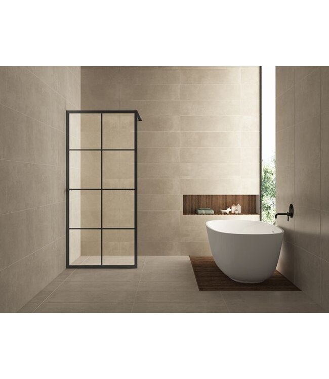 Het aluminium profiel in mat zwart geeft de inloopdouche een moderne en stijlvolle uitstraling. Het rasterdesign voegt een uniek element toe aan het geheel, terwijl de stabilisatiestang zorgt voor extra stevigheid.