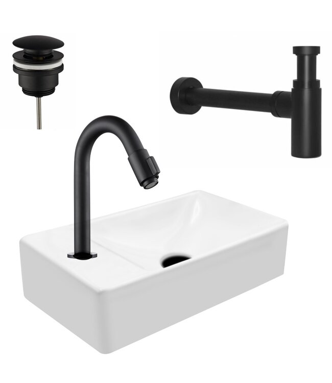 Mini Fonteinset Zwart Wit Mat Kraangat Links met toiletkraan draaiknop 37x22x10cm Aloni