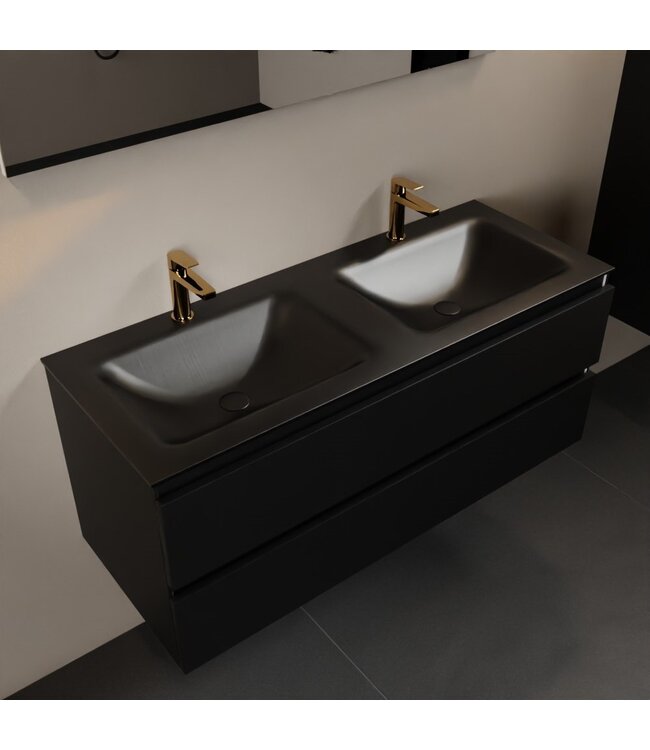 De bijbehorende Urban Mat Zwarte wastafel is gemaakt van Solid Surface, een antibacterieel materiaal dat eenvoudig te reinigen is. Met een breedte van 121cm en een diepte van 46cm biedt deze dubbele wasbak voldoende ruimte voor dagelijks gebruik. De dubbele spoelbakken van elk 47cm breed en de twee kraangaten maken dit wastafelmeubel perfect voor gedeeld gebruik. De wastafel heeft een verfijnde afwerking en is slechts 0,9cm hoog, wat bijdraagt aan de minimalistische uitstraling.