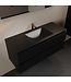 De bijpassende wastafel in Solid Surface mat zwart is niet alleen elegant maar ook antibacterieel, wat bijdraagt aan hygiëne in je badkamer. De wasbak, gepositioneerd in het midden, heeft een breedte van 47 cm en is uitgerust met één kraangat. Dit badkamermeubel is veelzijdig en past perfect in een luxe badkamerinterieur.