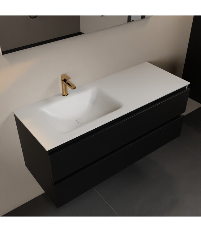 Creëer een moderne uitstraling in uw badkamer met het Mondiaz AIVY badkamermeubel. Dit meubel combineert een stijlvolle onderkast in urban mat zwart melamine met een elegante solid surface wastafel in talc mat wit. Met een breedte van 120 cm biedt het meubel voldoende opbergruimte dankzij twee ruime softclose lades. De wastafel is uitgerust met een enkele spoelbak, links gepositioneerd, en heeft een kraangat.