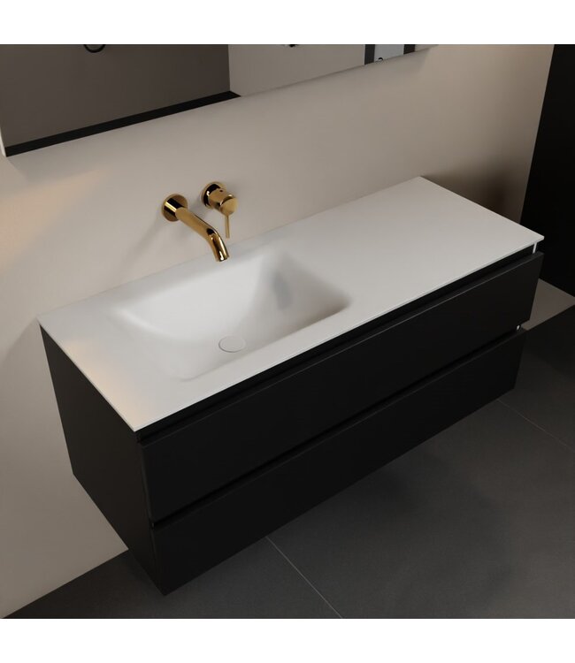 Creëer een strakke en moderne uitstraling in je badkamer met het Mondiaz AIVY badkamermeubel 120cm. De onderkast in Urban Mat Zwart is gemaakt van duurzaam melamine en biedt met zijn twee softclose lades voldoende opbergruimte voor al je badkamerbenodigdheden. De voelbare houtstructuur geeft de kast een natuurlijke en elegante uitstraling.