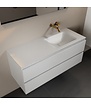 De meegeleverde wastafel van Solid Surface in Mat Wit heeft een verfijnde afwerking en beschikt over een enkele spoelbak aan de rechterzijde. Met een breedte van 121 cm en een diepte van 46 cm biedt deze onderkast met wastafelgenoeg ruimte en comfort. Dankzij de antibacteriële eigenschappen van het materiaal is hygiëne gegarandeerd. De wastafel wordt geleverd zonder kraangaten, wat flexibiliteit biedt in de keuze van een vrijstaande of wandkraan.