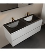 Het Mondiaz AIVY badkamermeubel biedt de perfecte combinatie van stijl en functionaliteit voor uw badkamer. Dit badmeubel met wastafel heeft een elegante onderkast in Talc Mat Zwart, gemaakt van melamine voor duurzaamheid en een luxe uitstraling. De wastafel van Solid Surface in mat wit heeft twee spoelbakken, ideaal voor een druk huishouden. De dubbele kraangaten bieden flexibiliteit bij het kiezen van de juiste kranen. Het wastafelmeubel wordt geleverd met twee soft-close lades, zodat u altijd eenvoudig bij uw spullen kunt.