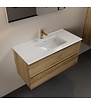 De bijpassende mat witte wastafel van keramiek heeft een centrale spoelbak van 47 cm breed en is antibacterieel afgewerkt. Dankzij het kraangat is het meubel direct klaar voor installatie van een kraan naar keuze. Het meubel heeft een breedte van 101 cm, waardoor het perfect past in zowel kleine als grote badkamers. Bovendien is maatwerk mogelijk voor een persoonlijke touch.