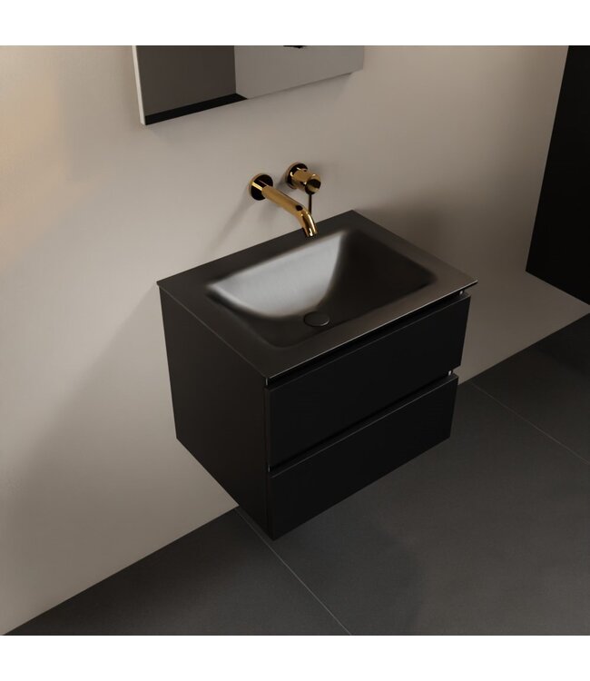 Geef je badkamer een moderne uitstraling met het Mondiaz Badkamermeubel AIVY. Dit stijlvolle badkamermeubel combineert een mat zwarte wastafel van Solid Surface met een bijpassende onderkast van melamine. Met een breedte van 60 cm is dit wastafelmeubel perfect voor compacte badkamers. De wastafel, met een elegante diepte van 46,5 cm, biedt een centrale spoelbak zonder kraangat, wat een strak design creëert.