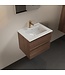 De onderkast in een elegante mocha-kleur is gemaakt van hoogwaardig melamine en beschikt over twee ruime lades met softclose-geleiders. Dit zorgt niet alleen voor een luxe uitstraling maar ook voor een soepel en geruisloos gebruik. De wastafel heeft een breedte van 61 cm en een diepte van 46,5 cm, wat voldoende ruimte biedt voor dagelijks gebruik.