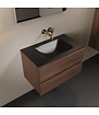 De wastafel, met een breedte van 81 cm en een subtiele dikte van 1,8 cm, is perfect gecentreerd en heeft geen kraangaten, wat zorgt voor een minimalistische look. Combineer dit wastafelmeubel met je favoriete kraan en afvoerplug (apart verkrijgbaar) voor een compleet badkamerontwerp.